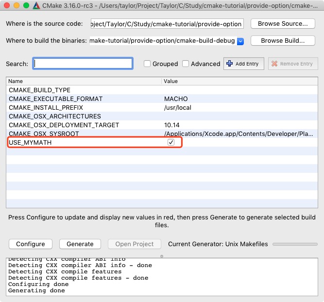 点击左下角 Generate 按钮,软件会弹出的选择项目生成器的弹窗,这里默认就好,点击点击 Done 按钮,cmake-gui 开始编译项目,生成中间文件,并且可以在软件看到我们为用户提供的选项: