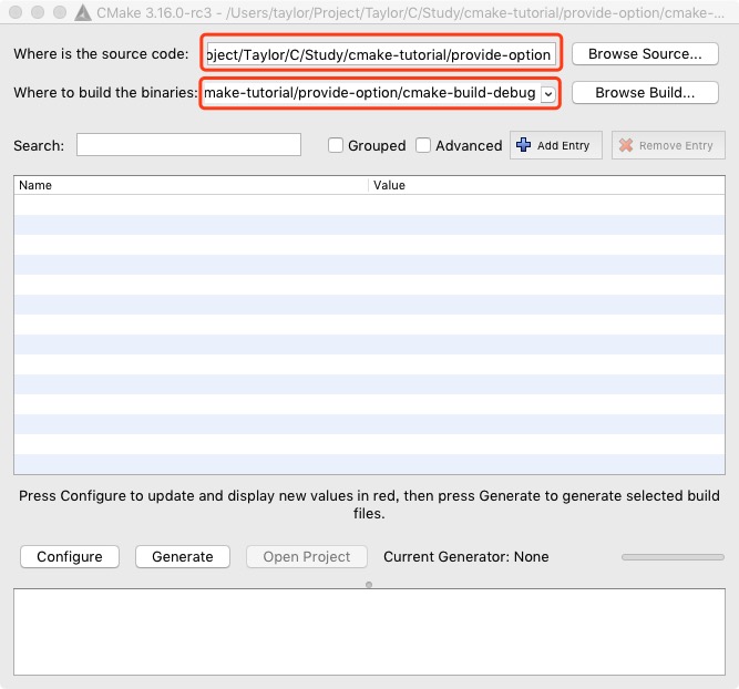 在 download 上根据自己的平台下载对应版本的 cmake-gui,安装后打开软件,选择源代码目录和生成文件,如下图所示: