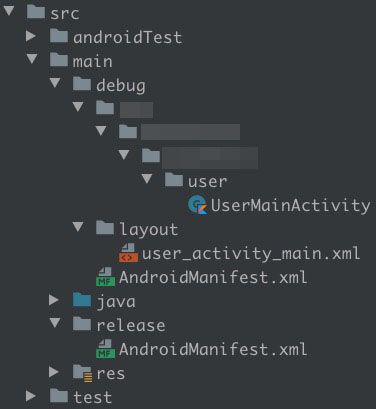 在 user-impl 的 src/main 的目录下创建两个文件夹 release 和 debug,release 中放 library 模式下的 AndroidManifest.xml,debug 放 application 模式下的 AndroidManifest.xml、代码和资源,如下图所示: