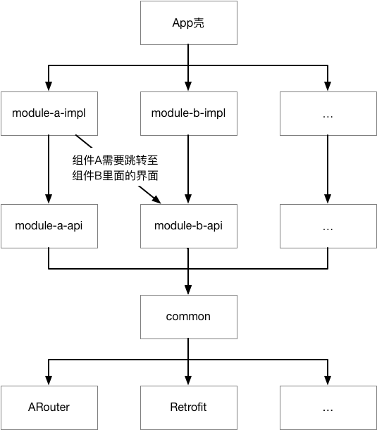 在组件化开发的早期,一个组件就只有一个 module,导致很多代码和资源都会下沉到 common 中,导致 common 会变得很臃肿。有的文章说,专门建立一个 module 来存放通用资源,我感觉这样是治标不治本,直到后面看到微信Android模块化架构重构实践这篇文章,里面的"模块的一般组织方式"一节提到一个模块应该有多个工程,然后开始在项目对 module 进行拆分。